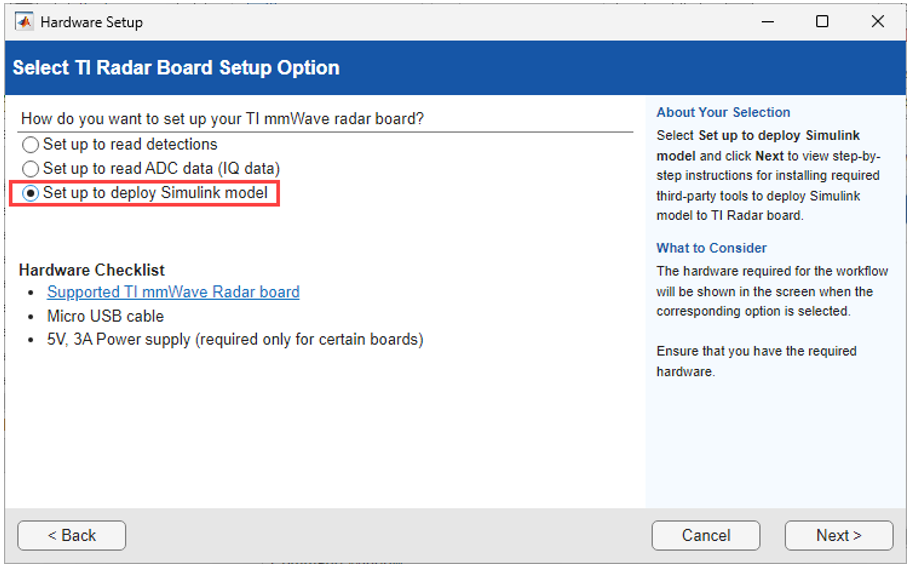To model, build, and deploy applications using the Radar Toolbox Support Package for Texas Instruments mmWave Radar Sensors, you must install additional third-party software. The Hardware Setup process guides you through these installation steps.