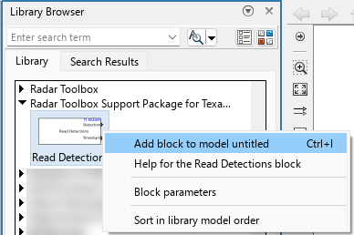 3. Locate the Read Detections block. Right-click the block and select Add block to model to add it to your model canvas.