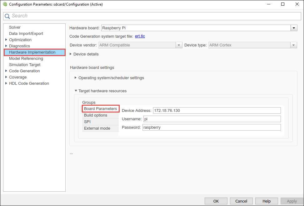 2. In the Hardware board settings pane, expand Target hardware resources and select Board Parameters. Specify these parameter values: