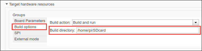 3. Select Build options, and specify the location where you want to save the MAT-files in the Build directory parameter.