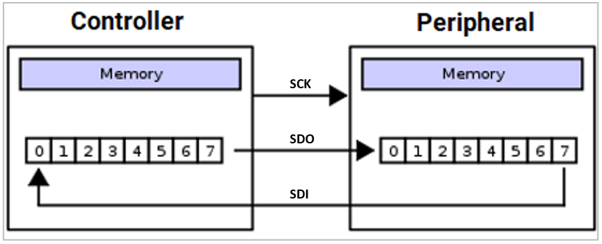 As each SPI transfer is a full duplex transmission, the Controller sends a bit on SDO line and the peripheral device reads it. The peripheral device also sends a bit on the SDI line and the Controller reads it.