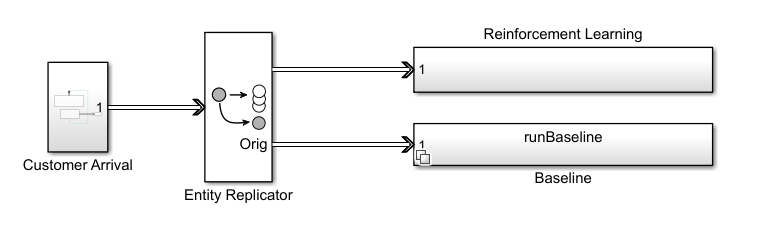 In this example, you model customer arrivals using the SimEvents Entity Generator block; see Entity Generator (SimEvents) for more information. The Entity Generator block assigns each customer a product time (cart size) at generation. To enable comparison between the reinforcement learning and the baseline strategies, the Entity Replicator block clones each generated customer, and then sends the same customer through both the RL and baseline strategies block. Each of the two strategy block routes the customer to one of the four queues. When a customer joins a queue, the corresponding queue block assigns the appropriate service time distribution based on the register type.