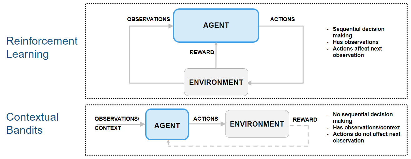 The following figure shows how contextual bandit problems are special cases of reinforcement learning problems.