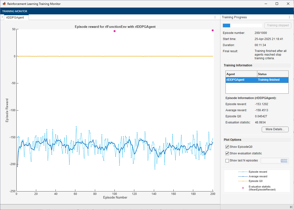 doTraining =false; if doTraining % Train the agent. Save the final agent and training results. pgTrainingRes = train(ddpgAgent,env,trainOpts,Evaluator=evl); % Uncomment to save the trained agent and results. % save("rgsnDDPGAgent.mat","ddpgAgent","pgTrainingRes") else % Load the pretrained agent and results for the example. load("rgsnDDPGAgent.mat","ddpgAgent","pgTrainingRes") end