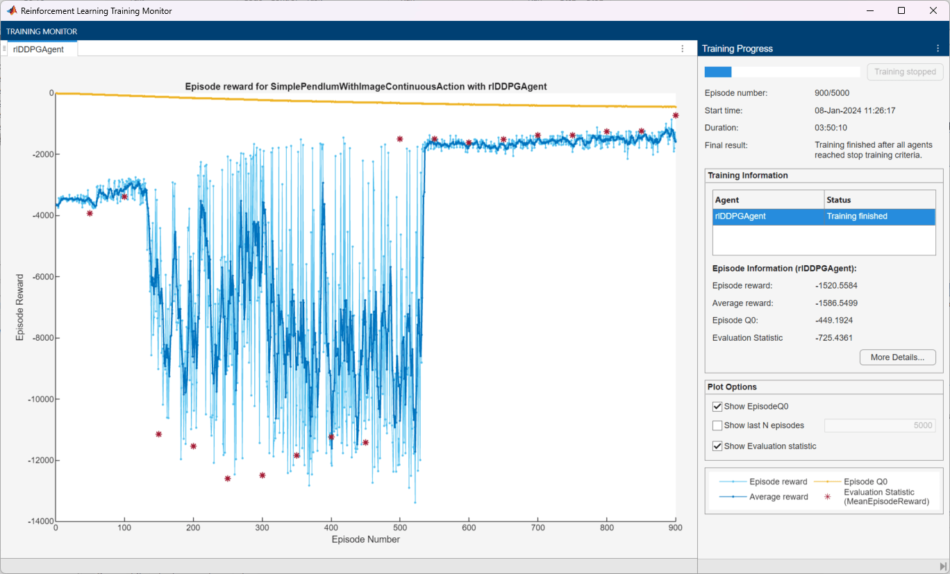 maxepisodes = 5000; maxsteps = 400; trainingOptions = rlTrainingOptions(... MaxEpisodes=maxepisodes,... MaxStepsPerEpisode=maxsteps,... Plots="training-progress",... StopTrainingCriteria="EvaluationStatistic",... StopTrainingValue=-740);