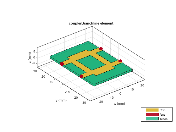 Use the design function to create a branchline coupler at the desired frequency. Visualize the coupler. The default substrate for a branchline coupler is Teflon.