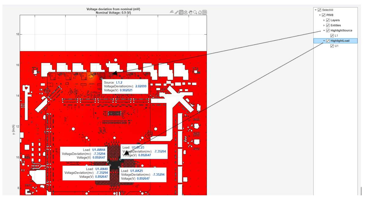 After running the voltage analysis and plotting the results, you can interactively explore the voltage behavior in the PDN.