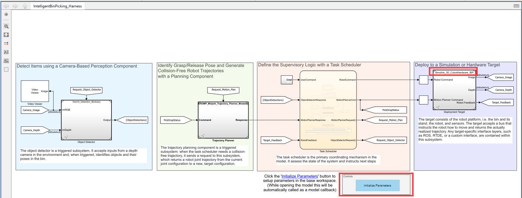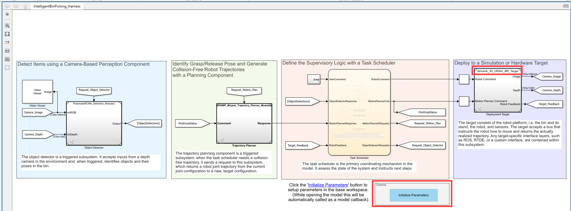 You need to set the target environment to support URSim simulator, set the gripper type, specify the IP address, and run the initRobotModelParam helper function to initialize and load all the necessary parameters in the IntelligentBinPicking_Harness.slx model. The model also executes this function at startup as part of a PreLoadFcn callback.