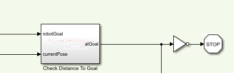 Check Distance to Goal 서브시스템은 목표까지의 현재 거리를 계산하고 임계값 내에 있으면 시뮬레이션을 중지합니다.