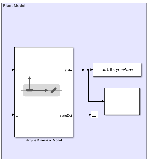 Bicycle Kinematic Model 블록은 단순한 이동체 기구학을 시뮬레이션하는 이동체 모델을 만듭니다. 이 블록은 선속도와 각속도를 Pure Pursuit 제어기 블록의 명령 입력으로 받고 현재 위치 상태와 속도 상태를 출력합니다.