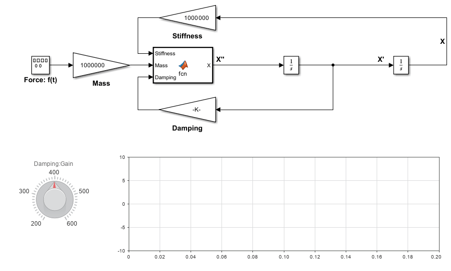 대시보드 블록 Knob와 Dashboard Scope는 감쇠를 조정하고 파형을 모니터링하기 위한 시각적 툴을 제공합니다. Knob 블록은 Damping Gain 블록에 연결됩니다. Dashboard Scope 블록은 Force: f(t):1 및 X 신호에 연결됩니다.