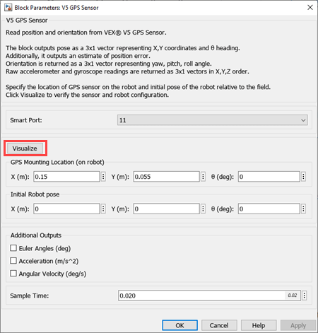 1. In the Simulink model, double-click the V5 GPS Sensor block to open the block parameter dialog box.