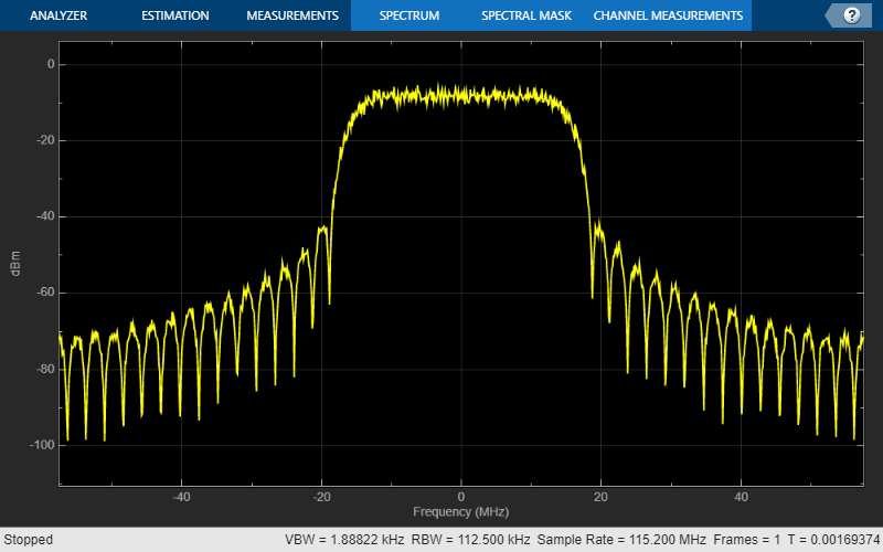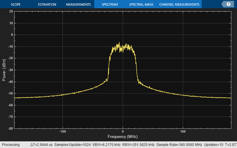 scope = spectrumAnalyzer; scope.SampleRate = cfg.SamplesPerSymbol*cfg.SymbolRate; scope(waveform)