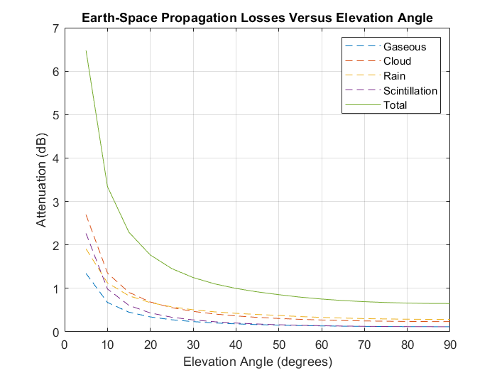 plot(elev_range,gaseous_attenuation,'--'); hold on; plot(elev_range,cloud_attenuation,'--'); hold on; plot(elev_range,rain_attenuation,'--'); hold on; plot(elev_range,scintillation_attenuation,'--'); hold on; plot(elev_range,total_attenuation); legend('Gaseous','Cloud','Rain','Scintillation','Total'); grid on; xlabel('Elevation Angle (degrees)'); ylabel('Attenuation (dB)'); title('Earth-Space Propagation Losses Versus Elevation Angle');