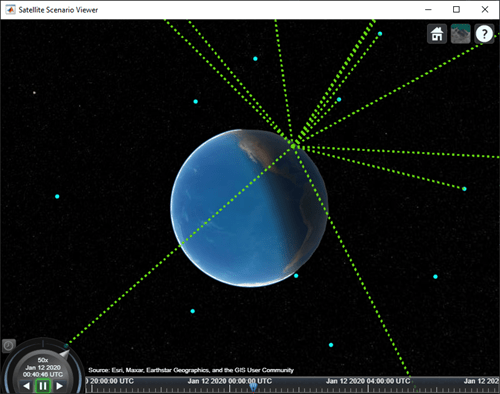 startTime = datetime(2020,6,02,8,23,0); stopTime = startTime + days(1); sampleTime = 60; sc = satelliteScenario(startTime,stopTime,sampleTime);