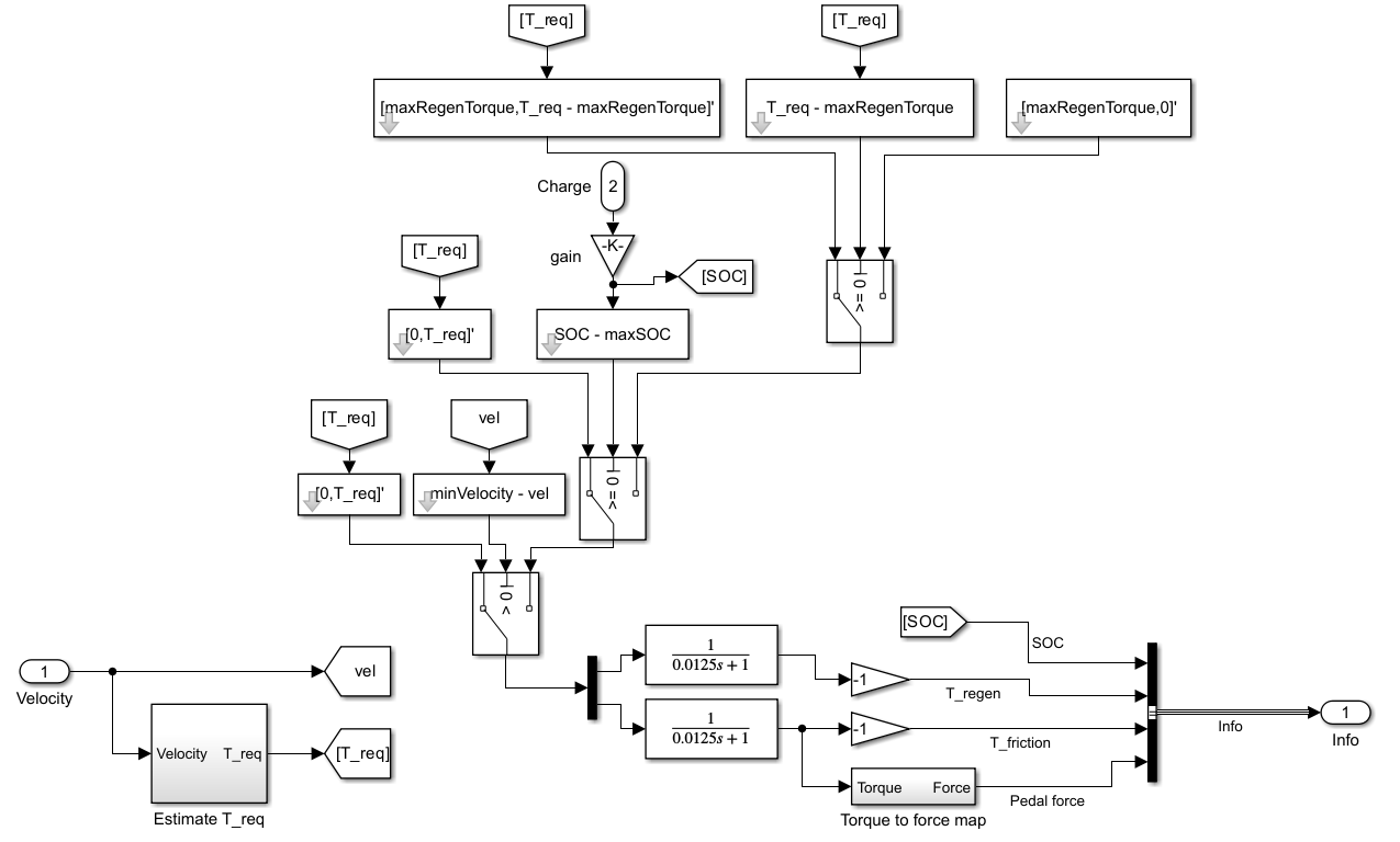 Regenerative braking relies on torque control governed by the controller, which calculates the required regenerative torque based on instantaneous velocity and SoC. The controller also calculates the necessary pedal force for frictional braking. To generate the required regenerative torque, the Motor & Drive block implements torque control, or equivalently current control. When the required regenerative torque is negative while the vehicle is moving forward, the torque functions to brake the vehicle during which, the regenerative braking system converts mechanical energy into electrical energy, which it then stored in the battery.
