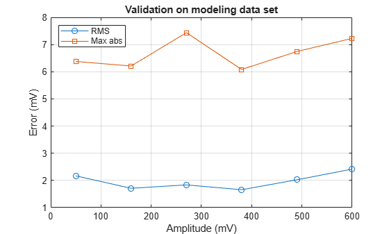 figure plot(txAmplitude*1000,errorRMS*1e3,'-o',txAmplitude*1000,errorMax*1e3,'-s'), grid on xlabel('Amplitude (mV)'),ylabel('Error (mV)'), title('Validation on modeling data set') legend('RMS','Max abs','Location','northwest')