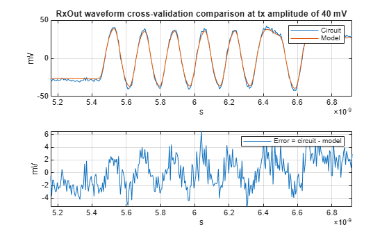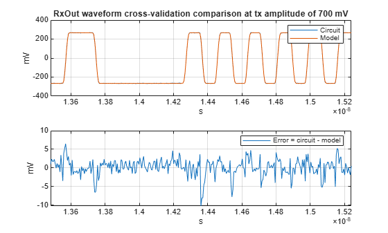 % Visualize figure validateAxisC(1) = subplot(211); plot(tXV,rxOutCircuitXV(:,1)*1e3,tXV,rxOutModelXVAligned(:,1)*1e3) legend('Circuit','Model') title(sprintf('RxOut waveform cross-validation comparison at tx amplitude of %g mV',txAmplitudeXV(1)*1000)) ylabel('mV'),xlabel('s') grid on validateAxisC(2) = subplot(212); plot(tXV,errorRxOutXV(:,1)*1e3) ylabel('mV'),xlabel('s') grid on legend('Error = circuit - model') linkaxes(validateAxisC,'x') xlim([t(maxAmp1Ndx)-10*symbolTime,t(maxAmp1Ndx)+10*symbolTime])