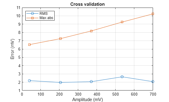 figure plot(txAmplitudeXV*1000,errorRMSXV*1e3,'-o',... txAmplitudeXV*1000,errorMaxXV*1e3,'-s'), grid on xlabel('Amplitude (mV)'), ylabel('Error (mV)'), title('Cross validation') legend('RMS','Max abs','location','northwest')