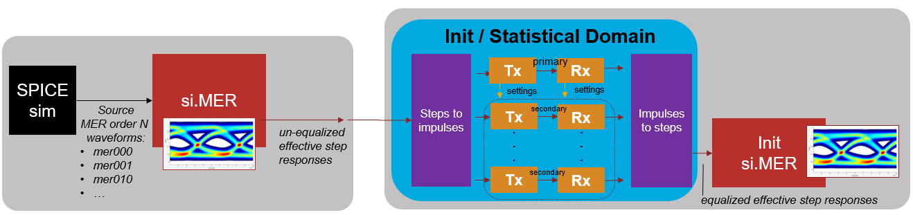 AMI_Init is based on impulse response processing. Since the system is MER characterized with multiple conditionally-LTI step responses, you can process each of these conditionally-LTI impulse responses with equalization to determine the resulting equalized statistical eye response. It is critical that all responses are equalized with the same equalization settings, otherwise incongruous results will occur. For example, if the impulse responses relating to the rising and falling effective step responses are equalized with a CTLE with different DC gains, then the resulting voltage swing of the equalized impulse responses will be different. When trying to use these imbalanced step responses to reconstruct a waveform, it would be impossible to return to a given terminal voltage after adding the rising and falling step responses together. Therefore, extensive efforts will be made to apply identical equalization settings to all the effective step responses.