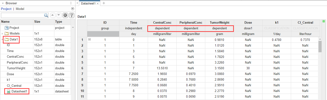 Tip: The data set also contains two variant columns k1 and Cl_Central, which contain group-specific values for the parameters k1 and Cl_Central. Optionally, you may classify them as covariate. A covariate is a value that a response may depend on and could be used as a category variable in plotting, for instance. For details on setting up group-specific variant columns, see variableNames.