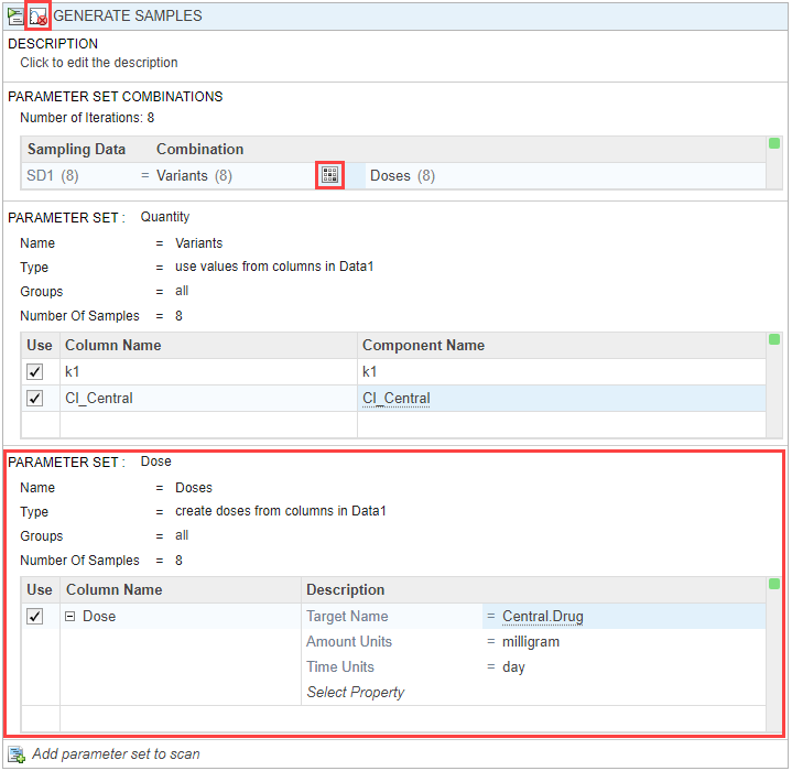 9. Near the top of Generate Samples step, under Parameter Set Combinations, double-click the grid icon