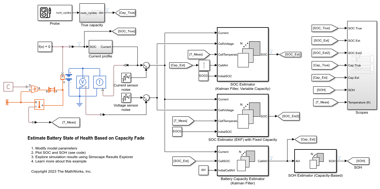 이 예제에서는 칼만 필터를 사용하여 배터리 용량과 SOH(성능 상태)를 추정하는 방법을 보여줍니다. 배터리의 초기 SOC(충전 상태)는 0.5입니다. 추정기는 SOC 초기 조건으로 0.8을 사용합니다. 배터리는 50시간 동안 계속 충전되고 방전됩니다. 이 예제에서는 확장 칼만 필터를 사용하여 배터리 용량(단위: 암페어시)과 SOC를 추정합니다. 배터리 용량에 대한 추정 오차는 4% 미만입니다. SOC는 확장 칼만 필터를 사용하여 추정됩니다. 고정 용량을 사용하는 경우 추정된 SOC 값은 실제 값과 다릅니다. 추정기의 기능을 보여주고 시뮬레이션 지속 시간을 제한하기 위해 이 예제에서는 용량 손실률이 증가하는 경우를 모델링합니다.