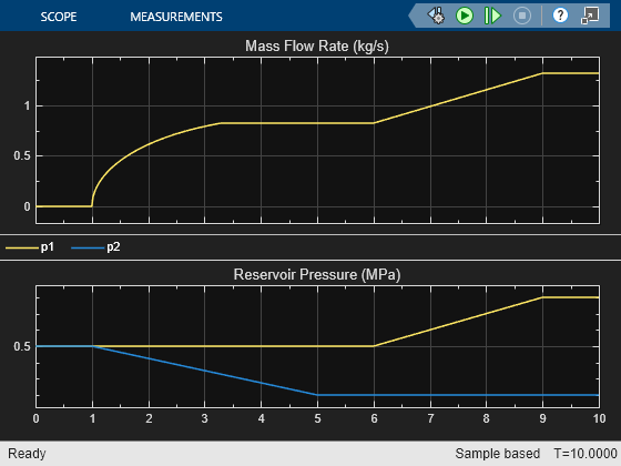 이 예제는 Local Restriction(G) 블록에 의해 모델링된 가스 오리피스의 초킹 동작을 보여줍니다. Controlled Reservoir(G) 블록은 가스 오리피스를 테스트하기 위해 Reservoir Inputs 서브시스템에서 제어되는 압력과 온도 경계 조건을 설정하는 데 사용됩니다.