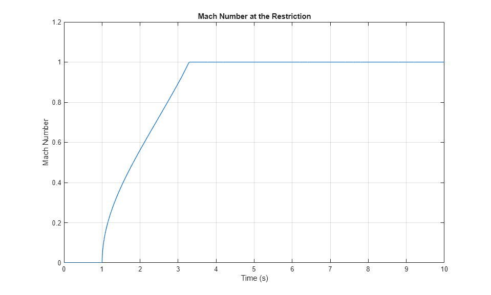 시작할 때, 유동은 초킹되지 않습니다. 다운스트림 압력이 감소함에 따라 질량 유량이 증가합니다. 3.3초에 유동이 초킹됩니다. 초킹된 질량 유량은 업스트림 조건에 따라서만 달라지므로, 다운스트림 압력이 추가로 감소해도 초킹된 질량 유량이 추가로 증가하지 않습니다. 그러나 6초에 업스트림 압력이 증가하므로, 초킹된 질량 유량은 다시 증가합니다.