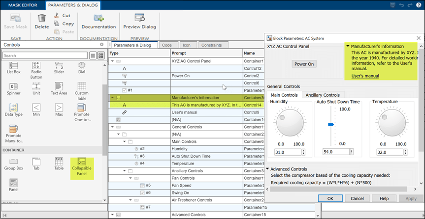 The General Controls section contains tabs to segregate and categorize information under Main Controls and Ancillary Controls. The Main Controls tab uses Dials and Slider to accept inputs for air conditioner parameters. You can edit the property of dial and slider in the property editor section of Mask Editor to place them horizontally or vertically.