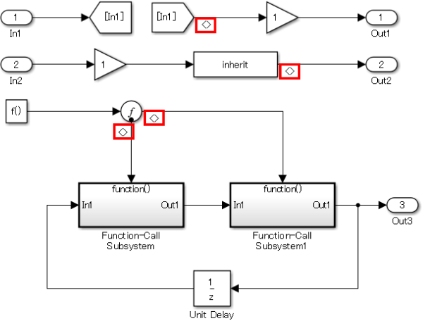 Function-Call Generator 및 Function-Call Split 블록에 연결되는 신호에는 이름이 없지만 Function-Call Split 및 Function-Call Subsystem 블록에 연결되는 신호에는 전파된 신호 표시가 선택됩니다.
