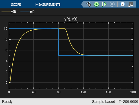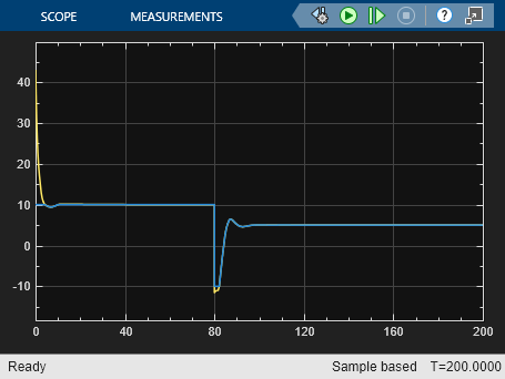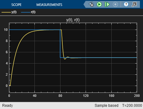 플랜트의 측정된 출력 y(t)와 제어기 출력 u(t)가 설정점의 변화에 거의 즉시 응답합니다. 설정점 값이 10일 때, 제어기 출력 u(t)가 액추에이터 범위 내로 감소하는 것을 볼 수 있습니다.