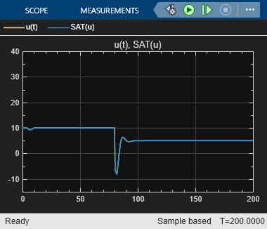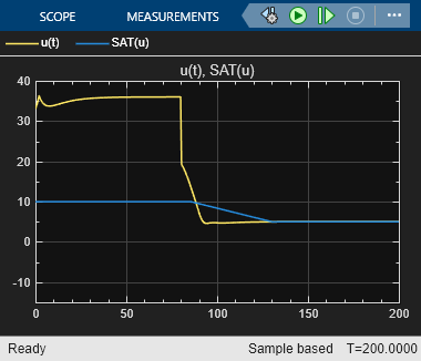 다음 그림은 출력 제한이 활성화되어 제어기 출력 u(t)와 포화된 입력 SAT(u)가 서로 일치하는 것을 보여줍니다.