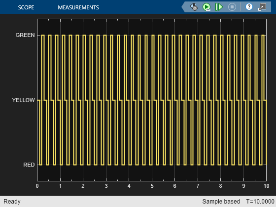 Simulate the model and visualize the results. The lamp shows the changing traffic light color during the simulation. The Scope shows how the signal type changes. Observe that at t = 0.1 s, the traffic light changes from yellow to red, and at t = 0.2 s, the light changes from red to green. In this simulation, the Simulation time per wall clock is set to 0.4. To change the simulation pacing, in the Simulink® toolstrip, on the Simulation, Debug, or Modeling tab, click the Run button arrow. Then, select Simulation Pacing.