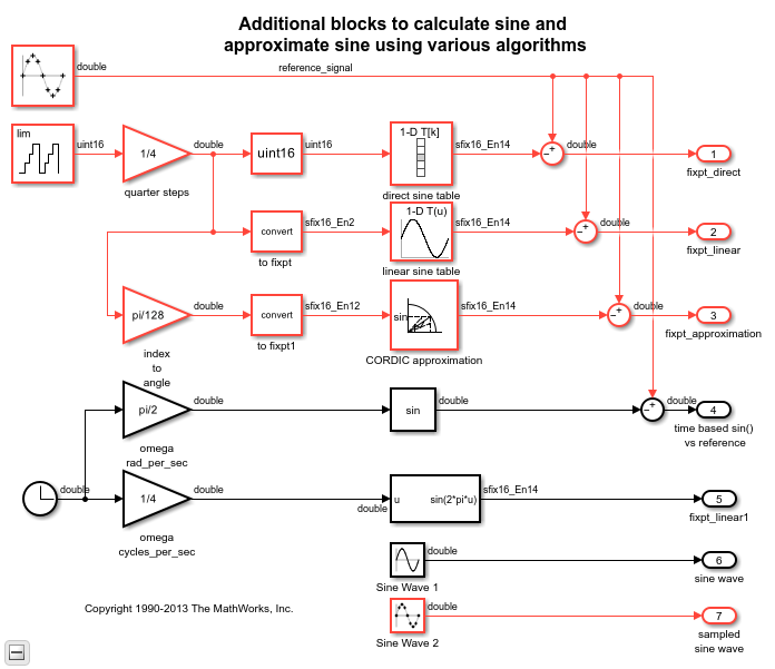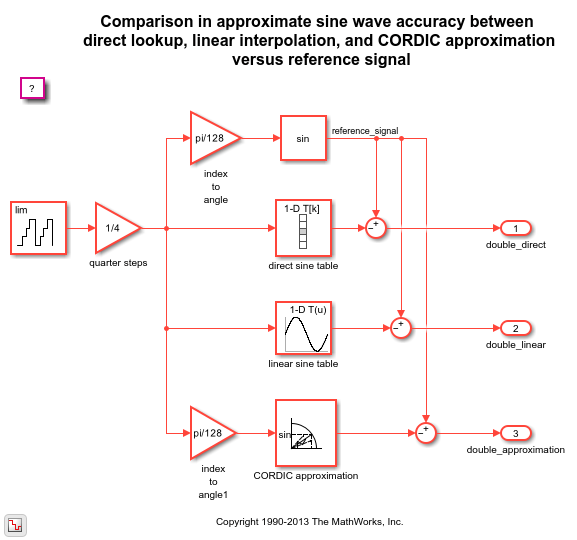 Simulink에는 연속 및 이산 모드를 갖는 Sine Wave 블록과, 사인 및 코사인의 사분파 대칭성을 활용하는 선형 보간된 룩업 테이블로 함수 근사를 구현하는 고정소수점 Sine 함수 블록 및 Cosine 함수 블록도 있습니다. sldemo_tonegen_fixpt 모델은 샘플링된 사인파 소스를 기준 신호로 사용하여 보간을 사용하거나 사용하지 않은 룩업 테이블과 비교하고, 고정소수점 데이터형의 CORDIC 사인 근사와 비교합니다.