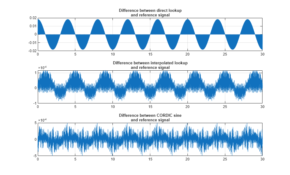 figure('Color',[1,1,1]); subplot(3,1,1), plot(out.tonegenOut.time, out.tonegenOut.signals(1).values); grid title({'Difference between direct lookup', 'and reference signal'}); subplot(3,1,2), plot(out.tonegenOut.time, out.tonegenOut.signals(2).values); grid title({'Difference between interpolated lookup', 'and reference signal'}); subplot(3,1,3), plot(out.tonegenOut.time, out.tonegenOut.signals(3).values); grid title({'Difference between CORDIC sine', 'and reference signal'});