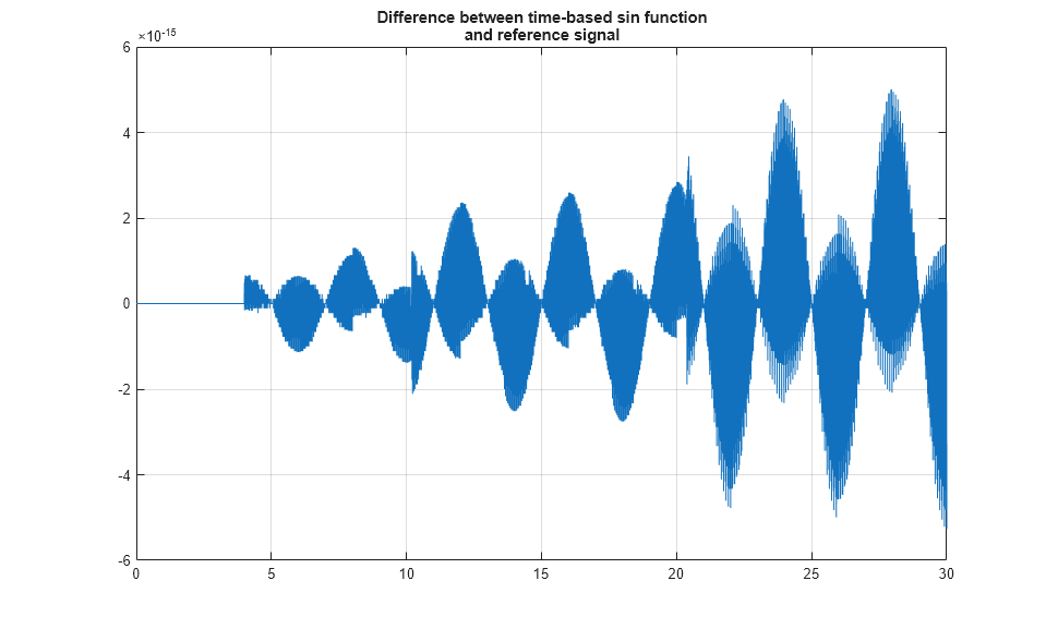title({'Difference between time-based sin function', 'and reference signal'});