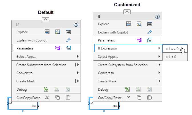 Simulink® context menus are the menus that open when you right-click something in Simulink. You can customize a subset of these menus: the context menu of the Simulink model canvas and the context menus of model elements in the model canvas such as blocks, signal lines, and annotations.