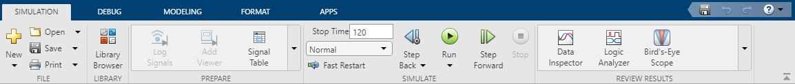Introduced before R2006aThe Simulink Toolstrip contains components that were previously available in menus and toolbars. To support common user workflow tasks, new tabs called Simulation, Debug, Modeling, Format, and Apps provide functionality corresponding to each task.