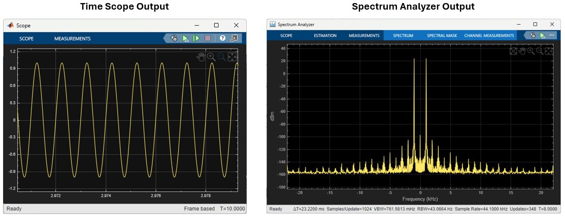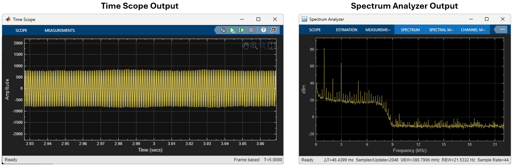 Open the Time Scope and Spectrum Analyzer blocks to observe the audio signal. You can see that the reconstructed audio signal does not nearly resemble the original continuous sine wave.