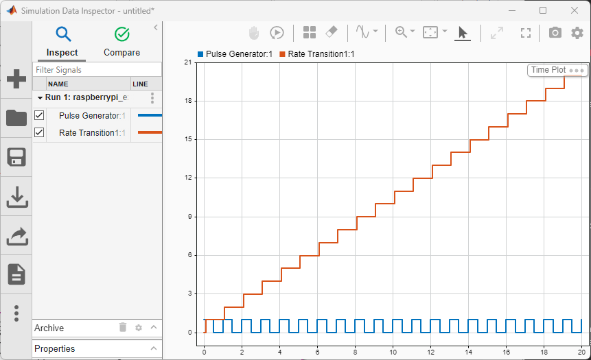 In the external mode of simulation (Monitor and Tune), a pulse generator provides simulation to the Raspberry Pi board digital pin externally. For every rising edge of this input pulse signal, the downstream function-call subsystem is triggered.