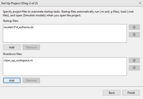 files), load (.mat files), or open (Simulink models) when you open the project.Use shutdown files to specify MATLAB code to run as the project shuts down. You do not need to use shutdown files to close models when you close a project, because it automatically closes any project models that are open, unless they are dirty. The project prompts you to save or discard changes.
