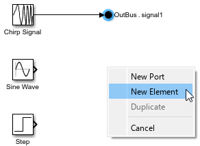 To create a second bus that contains the first bus and the output of the Step block, click and drag to select the Bus Creator and Step blocks. In the action bar that appears, click Create Bus. Including the Sine Wave and Chirp Signal blocks in your selection does not affect the result because these blocks provide elements of the input bus.