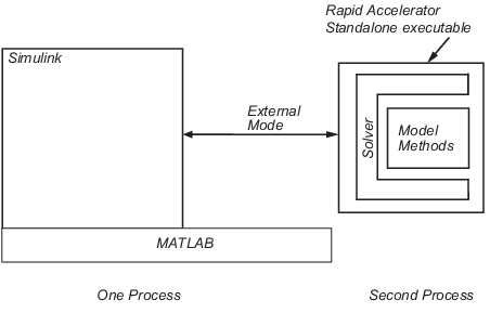 고속 액셀러레이터 모드는 모델에서 고속 액셀러레이터 독립형 실행 파일을 생성합니다. 이 실행 파일은 솔버와 모델 메서드를 포함하고 있지만 MATLAB 및 Simulink 외부에 있습니다. 따라서 Simulink와 통신하기 위해 외부 모드(External Mode Communication (Simulink Coder) 참조)를 사용합니다.