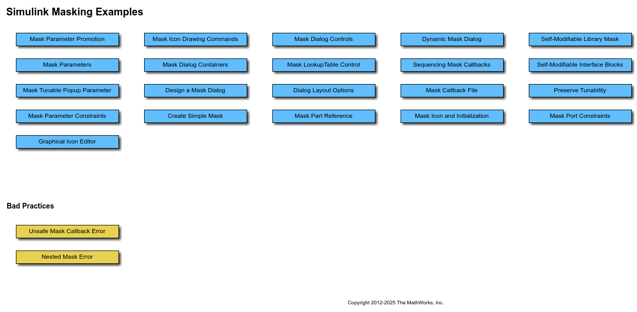 slexMaskingExamples 모델에는 Simulink® 마스크 처리 기능을 보여주는 일련의 개념적인 예제가 포함되어 있습니다.