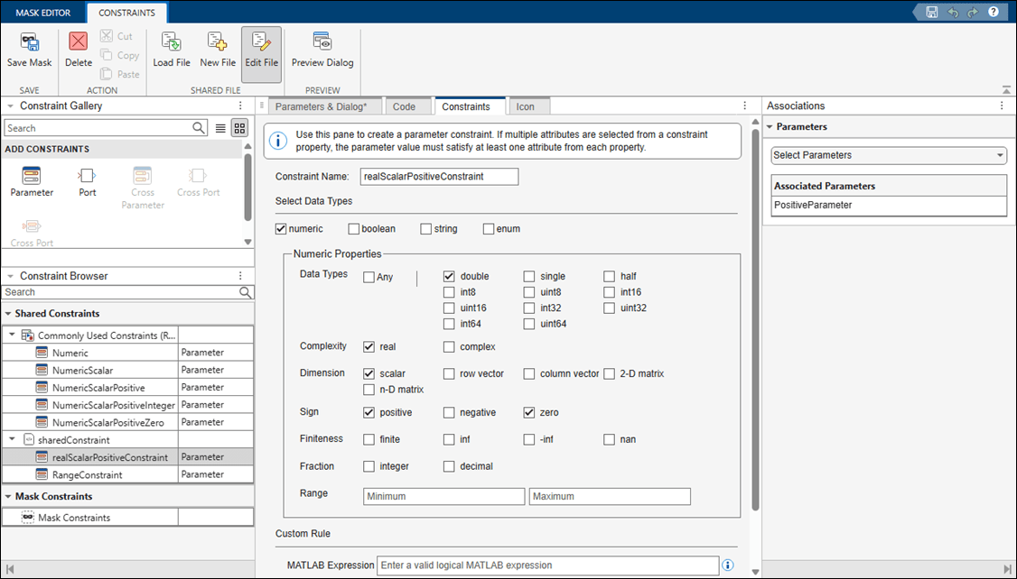 3. To associate the constraint with the parameter, in the Associations pane, in the Parameters section, select the parameter RealScalarPositiveParameter.
