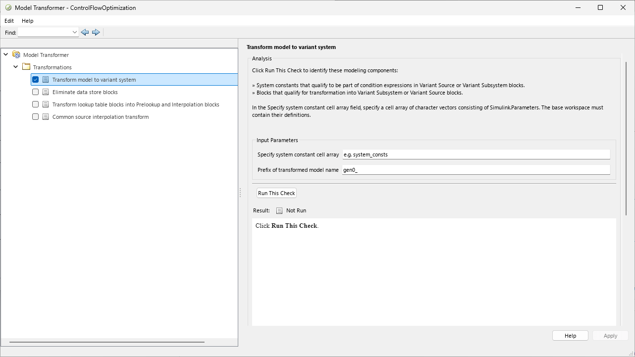 This example shows how to use the Model Transformer app to transform a model into a variant system. The example uses the model ControlFlowOptimization. This model has three Switch blocks. The control input to these Switch blocks is the Simulink.Parameter cond. The Model Transformer dialog box and this example refer to cond as a system constant.