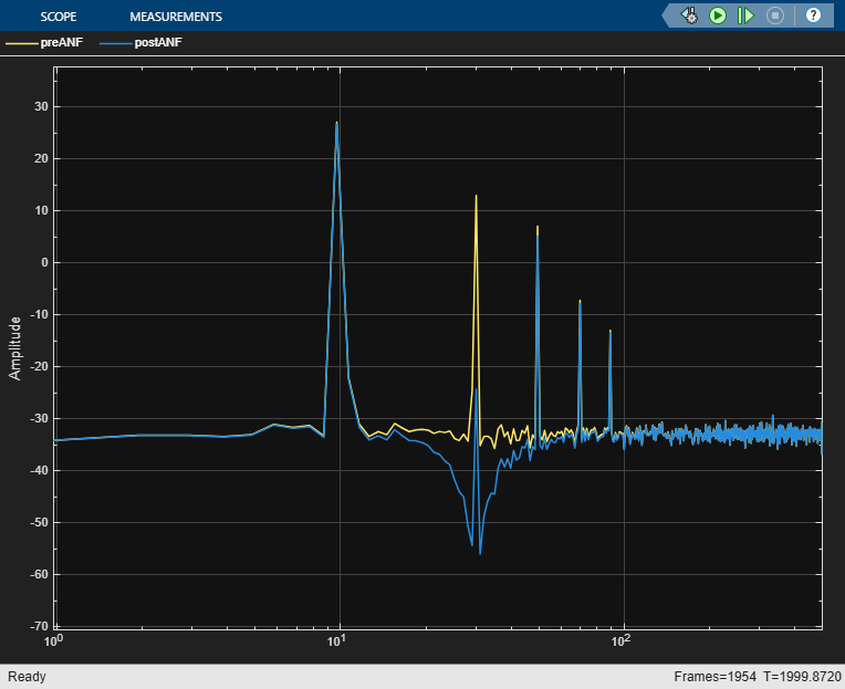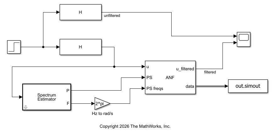 The model is configured to simulate a step response of the filtered and unfiltered plant output. The initial value of the Step block is set to 1 and the step occurs at 15 seconds. In this configuration, the input u of the ANF block is connected to the signal you want to filter, and PS and PS freqs are connected to the power spectrum and corresponding frequencies (in rad/s), obtained using the Spectrum Estimator block. Open the model.
