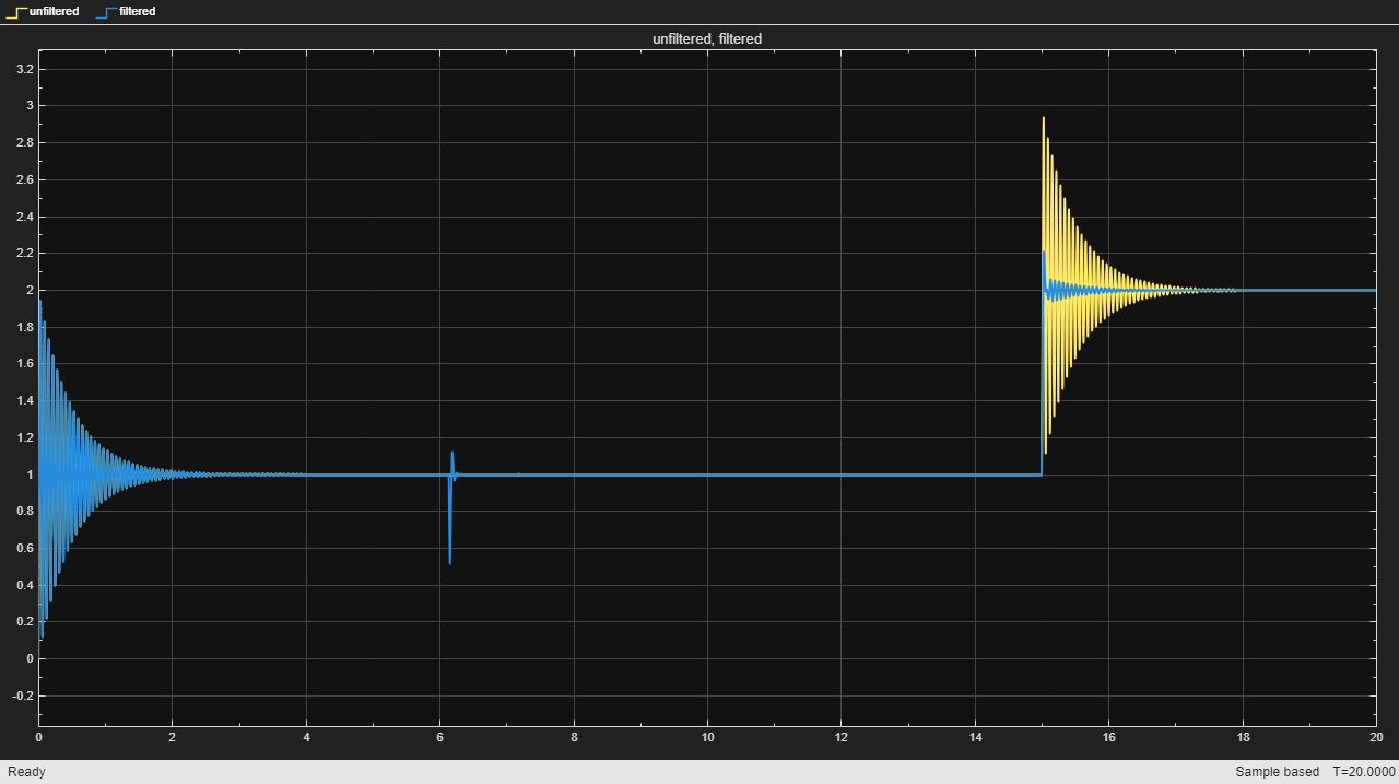 Simulate the model and display the unfiltered and filtered step response of the transfer function.