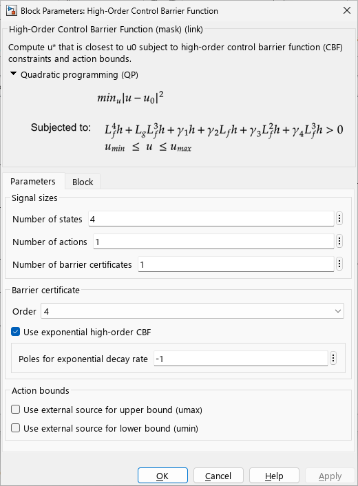 Enforce strict state-dependent high-relative degree safety for nonlinear systems. When you enable this option, the software automatically computes the constraint factor gains γi based on the poles specified in the Poles for exponential decay rate parameter.